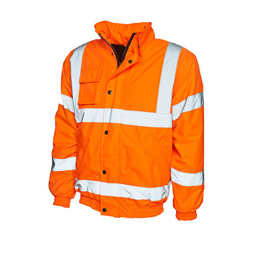 UC804 - Uneek Hi-Viz Bomber Jacket - 2 Colour Options - 100% Polyester PU Coated - EN471 Specification: Class 3 Approved - 2016/425 Cat II - EN343 Class 3:1 X Approved - GO/RT 3279 Issue 8 (Orange Only) - Conforming to 89/686/EEC Directive - Waterproof Taped Seams - 2 Band & 2 Brace - 2 Retro Reflective Strips (50MM wide) Around The Body and 1 Over Each Shoulder - Concealed Hood in Collar - 1 Inner Pocket and 2 Outer Pockets - Phone Pocket Right Chest as Worn - Padded and Lined- Washable - UKCA Certified - CE Certified